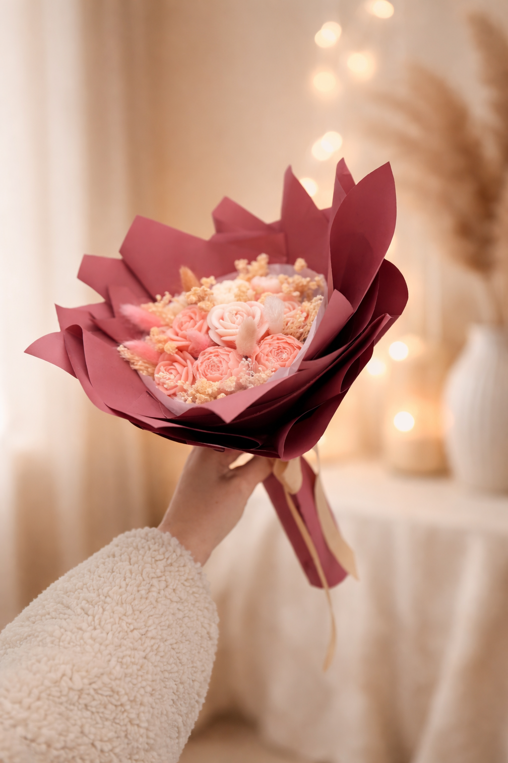 Ten oryginalny bukiet nie tylko zachwyca swoim wyglądem, ale też wprowadza do wnętrza przytulną, ciepłą atmosferę. Wieczne kwiaty z wosku sojowego pozostają piękne przez długi czas, co czyni bukiet trwałym i wyjątkowym elementem dekoracyjnym. Można go postawić na stole, komodzie czy w sypialni, gdzie stanie się subtelnym elementem aranżacji wnętrza. Bukiet sojowy to połączenie estetyki i ekologii – idealny dla osób ceniących naturalne produkty i designerskie detale.