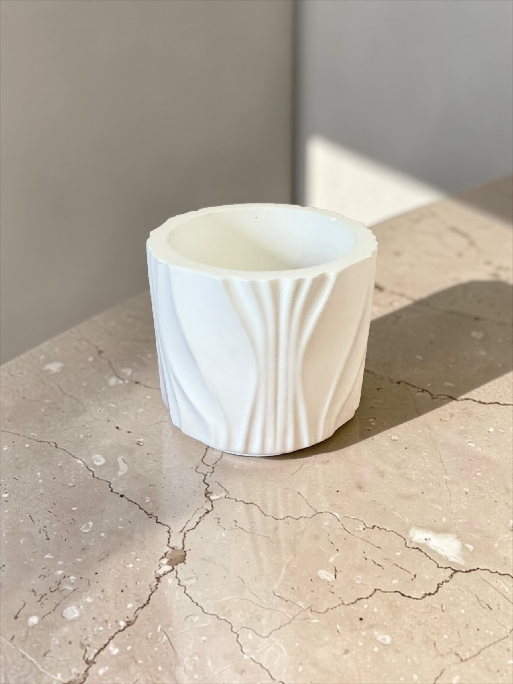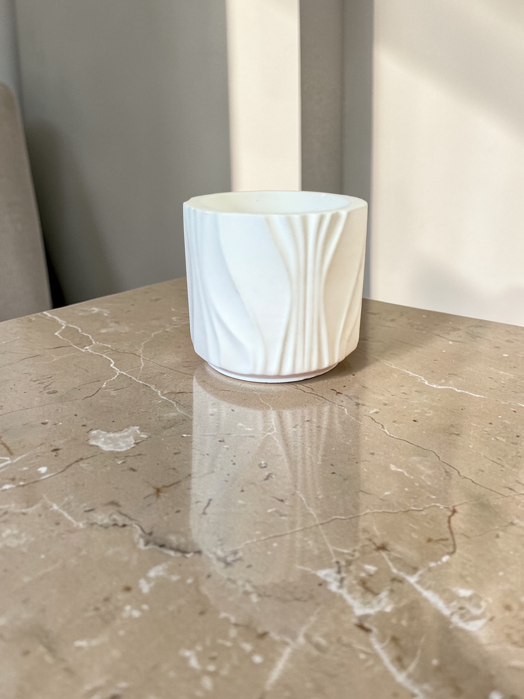 Kubek dekoracyjny ze żłobieniami wykonany z gipsu ceramicznego to minimalistyczna i nowoczesna ozdoba wnętrza. Subtelne zdobienia w formie żłobień nadają mu elegancki, ręcznie wykończony charakter, dzięki czemu świetnie wpisuje się w styl skandynawski, loftowy i premium minimalistyczny.