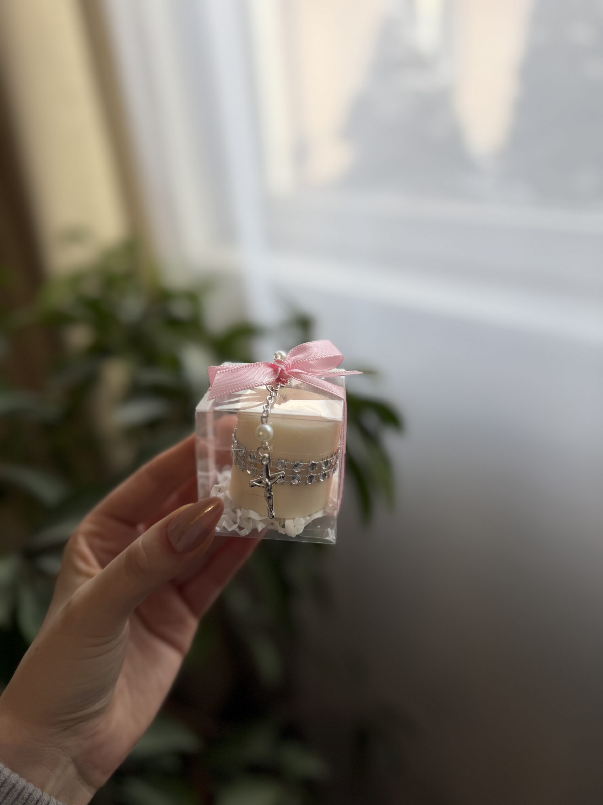 Każda świeca zapakowana jest w ozdobne pudełeczko z personalizowaną etykietą (imię dziecka, data komunii lub indywidualny tekst). Delikatny dziesiątek różańca podkreśla duchowy wymiar wydarzenia, dzięki czemu upominek idealnie pasuje jako podziękowanie dla gości komunijnych.