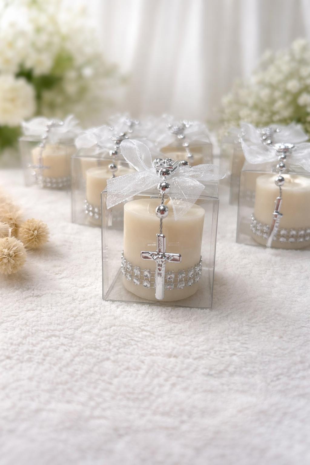 Świeca komunijna z dziesiątkiem różańca to eleganckie i symboliczne podziękowanie dla gości na Pierwszą Komunię Świętą. Ręcznie wykonana z naturalnego wosku sojowego świeca stanowi wyjątkową pamiątkę uroczystości, łącząc estetykę, religijny charakter i praktyczny upominek.